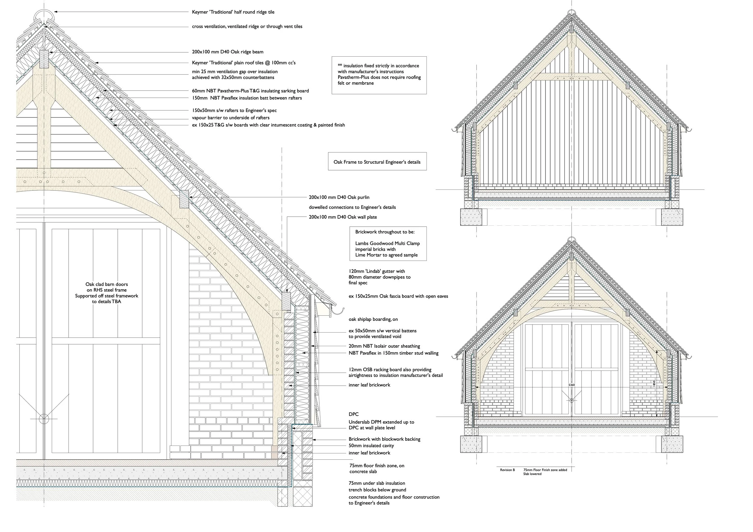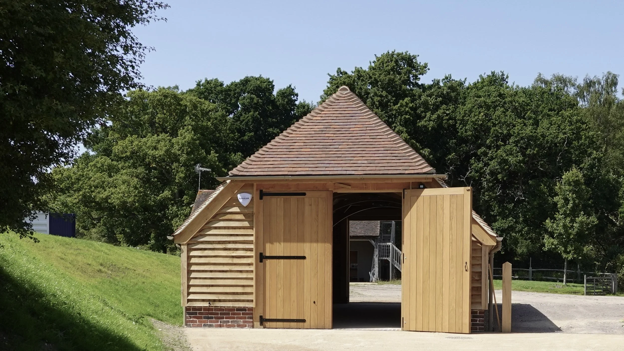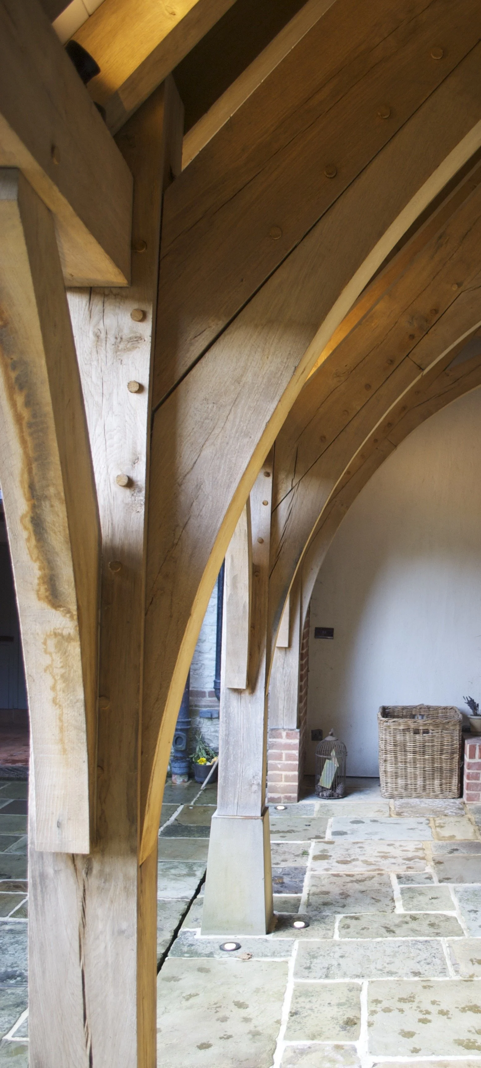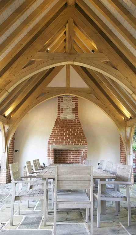 An oak framed loggia for outdoor dining as well as forming a route through to a pool area